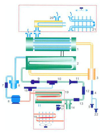 1、空氣熱交換器 2、蒸發器 3、氣液分離器 4、排水防堵過濾器 5、手動排污閥 6、制冷壓縮機 7、吸氣過濾器 8、汽化器 9、分液器 10、氣液混合器 11、熱力膨脹閥 12、視鏡 13、干燥過濾器 14、儲液器 15、熱氣旁通閥 16、水量調節閥 17、水質過濾器 18、冷凝器(風冷) 19、冷凝器(水冷) 20、前置預冷器(水冷) 21、前置預冷器(風冷) 22、自動排水器 |