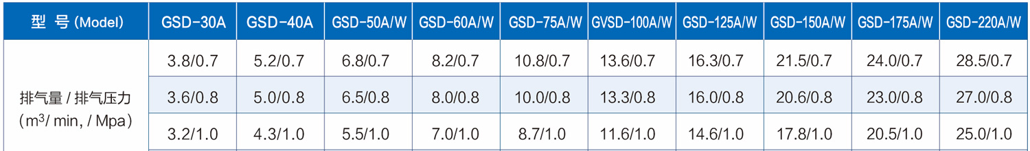GSD系列(直聯)螺桿式空氣壓縮機技術參數(22kW-160kW)